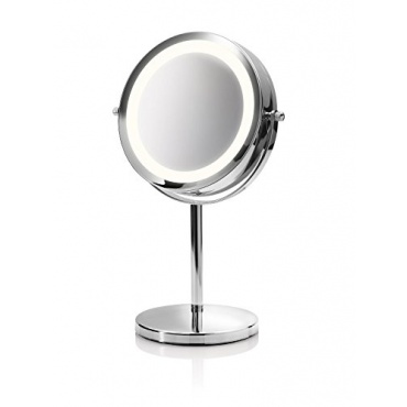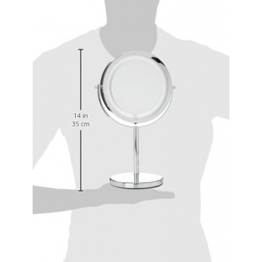 Der drehbare Spiegel ist auf einem Ständer mit flachem Fuß montiert und lässt sich drehen. Die eine Seite des Spiegels wirft eine fünffach vergrößerte Reflexion zurück, während die andere Seite das unvergrößerte Spiegelbild zeigt. 16 LEDs befinden sich im Rand des Spiegels und beleuchten das Gesicht des Betrachters. Die Beleuchtung lässt sich mithilfe eines Kippschalters am Rand bedienen.