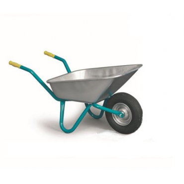 Die Mefro Schubkarre Standard ist mit einem Luftrad mit Schlauchbereifung ausgestattet, das über ein Nylon-Gleitlager sicher befestigt ist. Durch eine Stahlfelge wird das Rad bei schweren Lasten zusätzlich versteift. Die Schüssel besteht aus hochwertigem Tiefziehblech, wurde verzinkt und aus einem Stück gezogen. Um Rost vorzubeugen wurde das Chassis phosphatiert und mit Kunststoff beschichtet. Die Standbeine sind breit ausgestellt und ermöglichen einen sicheren Stand bei größtmöglicher Fußfreiheit beim Schieben.
