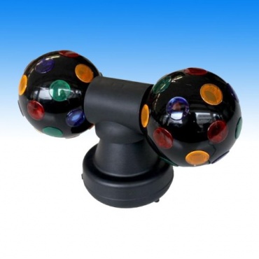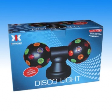 Die Megaprom Doppel Discokugel besteht aus 2 Kugeln mit einem Durchmesser von je 10 cm. Durch einen Motor drehen sich die beiden Kugeln und rotieren gleichzeitig um 360°. Sie werden über einen Ein- und Ausschalter bedient. Jede Kugel ist mit 20 runden Farblinsen in den Farben orange, grün, rot und blau versehen. Die Gesamtmaße der Discokugel betragen ca. 30 x 19 x 12 cm.