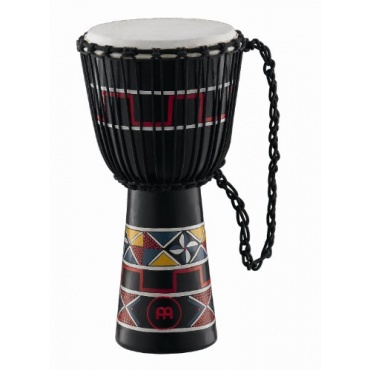 Die Djembe aus der Headliner Series von Meinl Percussion zeichnet sich durch ihre wunderbar gestaltete Optik aus. Das Instrument ist aus einem einziges Stück Mahagoni geschnitzt und ist schwarz lackiert. Auf dem schwarzen Untergrund sind in Rot, Weiß und Gelb eine Reihe von Motiven angebracht, die an den afrikanischen Ursprung der Djembe erinnern. Das Trommelfells ist aus Ziegenfell gemacht und mit einer Schnurspannung am Korpus angebracht.