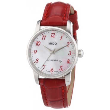 Edles rotes Leder, silberfarbenes 29 mm breites Edelstahlgehäuse und in ebensolchen Farben gehaltenes Ziffernblatt und Ziffern harmonieren im klassischen Design der Mido Damenuhr-Automatik Baroncelli Ii. Der Dornverschluß öffnet und schließt problemlos. Dank der hochwertigen Verarbeitung und der Verwendeten Materialien wie Saphirglas ist die Uhr bis zu 50 Metern wasserfest und stossfest.