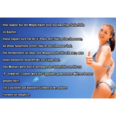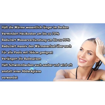 Mit der Miganeo Premium-Pool 366 cm Solarfolie Solarplane haben Sie auf jeden Fall die richtige Entscheidung getroffen und können sich auf lauwarme Stunden im beheizten Pool freuen. Die Plane wird über das Wasser gelegt, damit die Temperatur im Pool und beim Wasser hoch bleibt. Immerhin verhindert die Miganeo Premium-Pool 366 cm Solarfolie Solarplane die Ausdünstung des Wassers. Zudem besticht die Miganeo Premium-Pool 366 cm Solarfolie Solarplane durch die Optik.