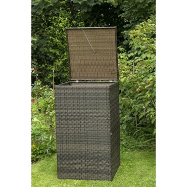 Mit Hilfe der Mülltonnenbox kann eine kleine Mülltonne optisch ansprechend und vor äußeren Einflüssen geschützt verstaut werden. Dank des ansprechenden und schlechten Designs integriert sich die Box mühelos in die Außenanlage und ist auch für den Einsatz in einem Garten geeignet. Um maximale Stabilität zu garantieren, besitzt die Box ein robustes Gestell aus Stahl, über das das Polyrattan Geflecht gezogen ist.
