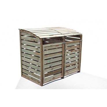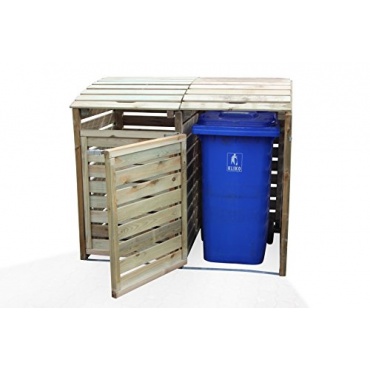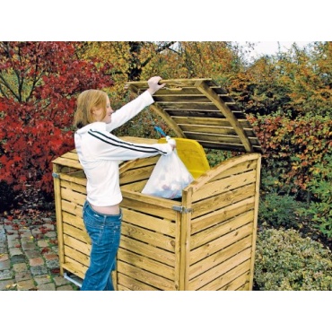 Aus kesseldruckimprägnierten Holz gefertigt ist die Mülltonnenbox. Sie besteht aus einer vollständigen Umkleidung, mit Rückwand und Deckel. Die Mülltonnenbox bietet ausreichend Platz für bis zu zwei Mülltonnen. Die Mülltonnen können hierbei ein Fassungsvermögen von bis zu 240 Liter haben. Die Türen und Klappen lassen sich bei der Mülltonnenbox einfach öffnen. Farblich ist die Mülltonnenbox in einem Naturfarbton gehalten. Aufgrund der Verarbeitung der Mülltonnenbox ist diese wetterfest. Als Zubehör wird die Mülltonnenbox mit allen notwendigen Befestigungsmitteln und einer Montageanleitung geliefert. Das Gewicht der Mülltonnenbox beträgt 70 kg.