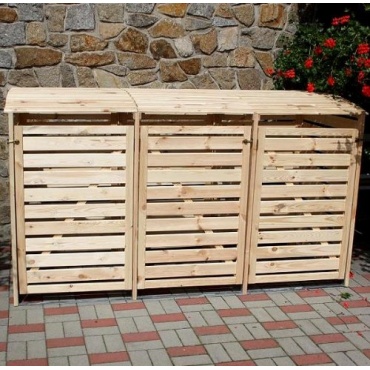 Frei stehende Mülltonnen verschandeln die Optik jedes Gartens und jeder Einfahrt. Die Mülltonnenbox von Prikker sorgt hier für Abhilfe und ist mit ihrem naturnahen Design zudem ein dekoratives Element. Die großräumige Box bietet Platz für drei Mülltonnen von jeweils 240 Liter Fassungsvermögen, die gut geschützt und doch leicht zugänglich in ihr untergebracht sind. Die Box ist aus Kiefernholz gearbeitet.