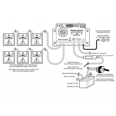 Die Marderabwehr wird über die 12 V Spannung der Batterie betrieben. Es schaltet automatisch ab, wenn es merkt, dass die Batteriespannung für einen Startvorgang nicht mehr ausreichen würde. Der Betrieb der Anlage wird über LEDs angezeigt. Durch die sechs Hochspannungskontaktplatten ist dieser Marderschreck für das KFZ effektiv und zugleich leicht in andere Fahrzeuge erneut einbaubar. Die Töne, die im Hochfrequenzbereich liegen sind für den Menschen kaum wahrnehmbar.