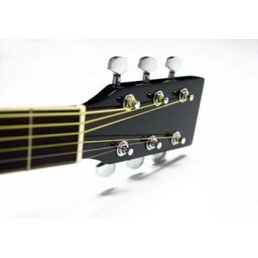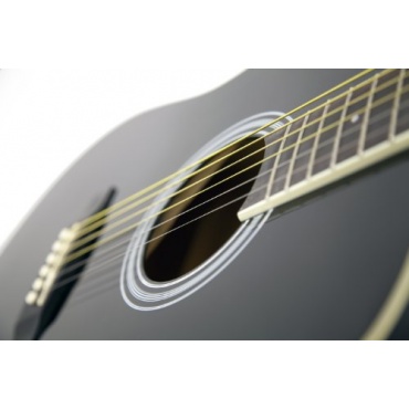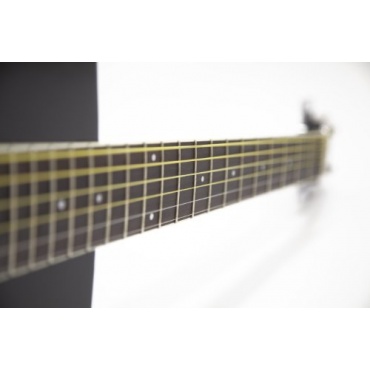 Die Navarra NV-1 Westerngitarre ist in glänzendem Schwarz gehalten. Die elfenbeinfarbigen Einfassungen und die Verzierung rund um das Schallloch schaffen einen geschmackvollen Kontrast und lassen die Gitarre sehr elegant wirken. Sie besteht aus hochwertigem Lindenholz. Das Griffbrett ist aus Pakkaholz gefertigt.