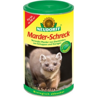 Der Marder- und Waschbär-Schreck von Neudorff wirkt zuverlässig gegen Marder, Waschbären und andere Tiere, wie Katzen oder Hunde. Dieses Fernhaltemittel vertreibt die Tiere von den Orten, an denen sie unerwünscht sind, wie zum Beispiel Dachböden, Gartenhäuser, Schuppen oder Garagen. Das anwendungsfertige Mittel wirkt durch für die Tiere unangenehme Geruchs- und Geschmacksstoffe. Diese natürlichen Inhaltsstoffe bestehen aus Lavandinöl, wodurch die Tiere ferngehalten aber nicht geschädigt werden.