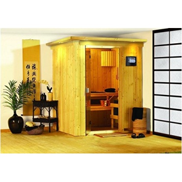 Die Sauna besteht aus hochwertigem Fichtenholz, was sich für die Sauna besonders gut eignet. Drei Halogenleuchten sorgen für eine schöne Beleuchtung im Innenraum. Die Konstruktion ist sehr belastbar und wiegt insgsamt 249 kg. Die Sauna verfügt über einen Fronteinstieg, der rechts oder links anschlagbar ist. Diese verfügt über eine edle Glastür in der Tür und ein weiteres Fenster.