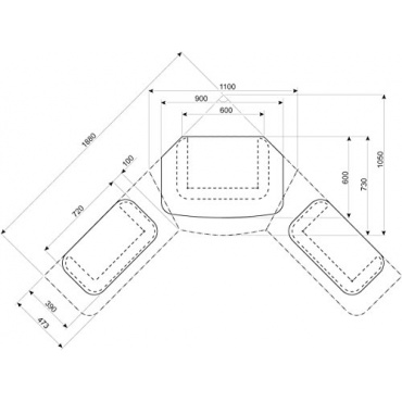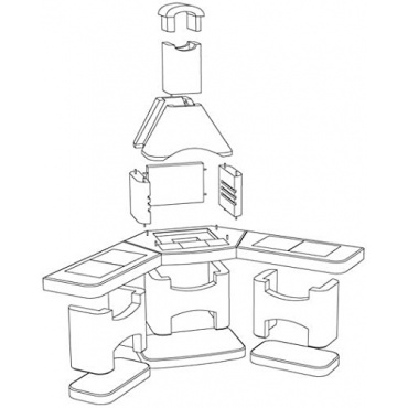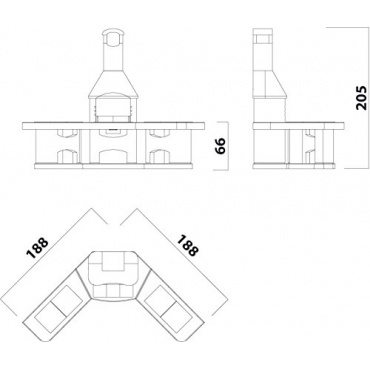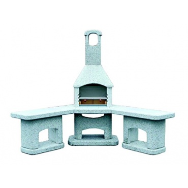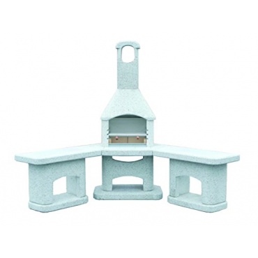 Die Maße der Außenküche betragen 205x188x66 cm und sie wiegt 980 Kg. Das Material des Grillkamins ist Beton bzw. Naturstein und die Grillfläche - bestehend aus dem Edelstahlgrillrost mit Holzgriffen - hat ein Maß von 53x38 cm. Unter dem Grill ist ein Aschekasten angebracht. Weiterhin besteht die Außenküche inkl. Grill aus 8-teiligen Schamottsteinen, einem Gussrost und einem Schutzblech. Der Zuschnitt der Arbeitsplatte ist schräg und weiße Quarzkörnung prägt das Bild der Oberfläche in Weißzement. Der Aufbauwinkel beträgt 90°.
