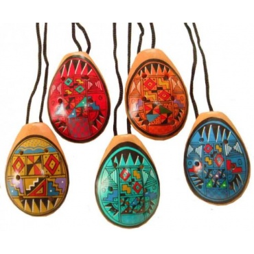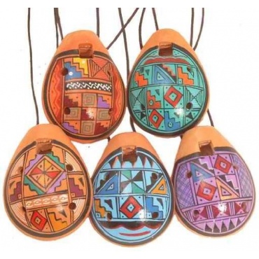 Okarina aus dem italienischen "Kleine Gans" ist eine Kugelflöte bzw. eine Gefäßflöte aus Ton mit 4, 6 oder mehr Löchern. In Peru wird es hauptsächlich von den Schamanen benutzt für Beschwörungen und Rituale. Sie werden auch hauptsächlich dort hergestellt mit all ihren schönen, Hand bemalten und schmucken Verzierungen. Durch das Umhänge Band hat man sie auch immer parat, bei spontanen Einsätzen zum Beispiel.