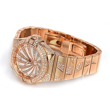 Mit dieser Uhr wird jede Frau die sie trägt im Mittelpunkt stehen. Eine Uhr, die durch ihre Einzigartigkeit zum Blickfang wird. Das Zifferblatt mit den Diamanten strahlt und sieht sehr schön aus. Das Rotgold dieser Uhr kommt sehr gut zur Geltung und lässt sich zu jedem Kleiderstil tragen. Diese Uhr des Herstellers Omega überzeugt durch ein perfektes Aussehen und ein sehr präzises Uhrwerk.