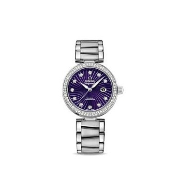 Mit der De Ville Ladymatic ist dem Hersteller Omega eine besonders schön und edel designte Armbanduhr für Damen gelungen. Das Armband besteht aus robustem Edelstahl und fällt mit seiner außergewöhnlichen polierten Formgebung sofort ins Auge. Das Diamanten violette Zifferblatt mit Leuchtzeigern wird von einem bruchsicheren Saphirglas geschützt, welches zusätzlich noch einmal von einer Lünette umgeben ist, welche mit kleinen funkelnden Diamanten besetzt wurde.
