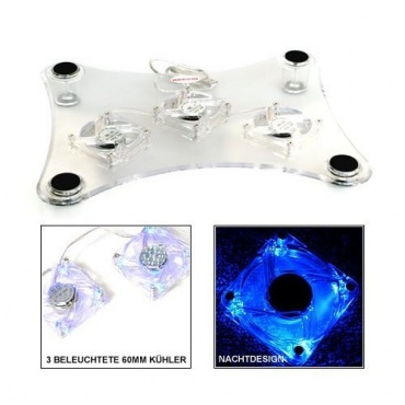 Jeder der Lüfter läuft mit 3200 Umdrehungen/Minute und die maximale Geräuschemission liegt bei 25 dB. Die Nennspannung des Kühlers beträgt 5 V und er setzt eine Luftmenge von 50,4 Kubikmetern pro Stunde um. Der durchschnittliche Stromverbrauch beträgt weniger als 0.9 W und wird direkt über den USB-Port geliefert. Die klare Konstruktion aus Acryl in Kombination mit den blau beleuchteten Lüftern verleiht dem Kühler ein modernes Design.
