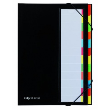 Der schwarze Pagna 44133-04 Deskorganizer besteht aus einem zwölf teiligen Color-Einband. Der Rücken der Mappe hat ein farbiges Griffregister. Mit einem praktischen Eckspanngummi werden alle Papiere zusammen gehalten. Mit dem Pagna Deskorganizer wird alles übersichtlich aufbewahrt.
