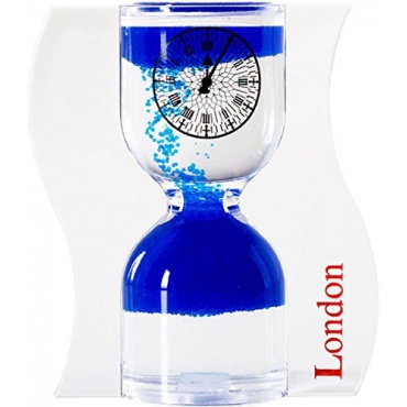 Per Hand wird die Teeuhr abgefüllt und einzeln versiegelt. Das Prinzip entstammt der altbewährten Sanduhr. Jedoch fließt das Granulat von oben nach unten. Grazil windet sich die aus Kunststoff bestehende Sanduhr in ihrer wellenförmigen Einfassung. Bewusst wurde für London City für das flüssige Granulat ein kräftige blau gewählt. Der Schriftzug London befindet sich in der Einfassung. Eine Uhr im alten Stil wertet das ohnehin schon faszinierende Design auf.