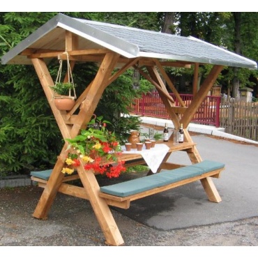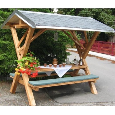 Der Partyfreisitz aus Holz von Made in Germany bietet genügend Platz für bis zu 8 Erwachsene oder 10 Kinder. Die Anlage besteht aus einem Tisch und zwei montieren Sitzbänken. Alle zusammen sind unter einem wasserdichten und wetterfesten Dach mit Bitumenschindeln angelegt. So werden die Gäste vor Regen und Sonne geschützt.