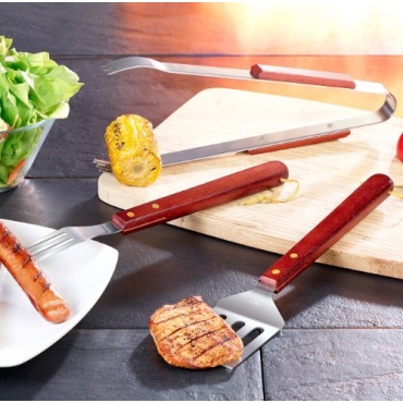 Aus Edelstahl gefertigt ist das Grillbesteck, bestehend aus einer Grillgabel, einer Grillzange und einem Wender. Der Griff beim Grillbesteck besteht aus Echtholz in einem rötlichen Farbton. Die Grillzange hat eine länge von 320 mm, die Grillgabel von 327 mm und letztlich der Wener eine länge von 326 mm. Das Grillbesteck ist jeweils am Griff mit einem kleinen Stückchen Schnur ausgestattet, sodass man das Grillbesteck auch aufhängen kann. Aufgrund der Materialeigenschaften, der Fertigung aus Edelstahl ist das Grillbesteck rostfrei und lässt sich einfach mit Wasser und Spülmittel reinigen.