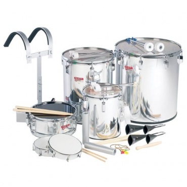 Das Set besteht aus einer 14"(35,5 cm) Surdo Samba Trommel, einer 18"(45,7 cm) Surdo Samba Trommel, einer 10"(25 cm) Repinique Samba Trommel, einem 12"(30 cm) Snare Drum, zwei 8"(20 cm) Tamborims,