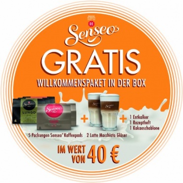 Die perlmuttsilber - weiße Philips Senseo HD7857 20OP Latte Duo-Kaffeepadmaschine wird in einem Willkommenspaket geliefert. Neben der Kaffeepadmaschine sind im Set fünf Packungen Senseo-Kaffeepads, sowie zwei Latte Macciato Gläser enthalten, wie auch ein Entkalter, und ein Rezeptheft, und eine Kakaoschablone.