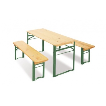 Hochwertig verarbeitet aus einer Stahlkonstruktion mit einer Holzplatte versehen ist der Tisch bei der Kinderfestzeltgarnitur. Gleich verarbeitet sind auch die beiden Bänke. Damit man die Kinderfestzeltgarnitur auch mal im freien einsetzen kann, ist die Stahlkonstruktion entsprechend mit Lack in einem grünen Farbton versehen. Die Holzplatten sind entsprechend mit einem Wetterschutzlack versehen. Der Tisch bei der Kinderfestzeltgarnitur hat die Abmessungen 110 x 40 x 51 cm. Die Abmessungen bei der beiden Bänken betragen 110 x 20 x 31 cm, bei einer Sitzhöhe von 31cm.