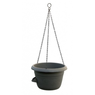 Die Blumenampel ist aus stabilstem PP Kunststoff und daher robust und bruchfest. Auf der Seite rundherum hat sie ein Ornament ähnliches Muster und sie hat die Farbe anthrazit. An dem Topf sind drei metallene Ketten die fest sitzen und oben in einen Haken laufen, zum Aufhängen der Ampel.