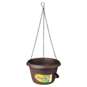Die Plastia Blumenampel Siesta besteht aus einem Blumentopf und einer ca. 30 cm langen Dreifachkette. Die Farbe des Topfes ist schokoladenbraun. Der Preis der Blumenampel wird mit 9,56 EUR ausgezeichnet. Die Blumenampel kann mit einem an den Ketten befestigten Ring aufgehängt werden. Durch die Dochtbewässerung ist eine leichte Bewässerung von außen möglich.