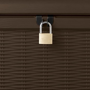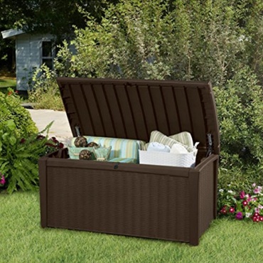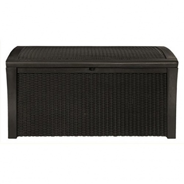 - Der größte Vorteil dieser Auflagenbox besteht darin, dass man sich auch auf die Box setzen kann. So wurde nicht nur Stauraum für die Auflagen der Gartenstühle gefunden, man auch noch gleich für mehr Sitzmöglichkeiten gesorgt. Durch die dunkle braune Farbe entsteht zusammen mit der künstlichen Rattan-Optik eine sehr elegante und sich perfekt in die Gartenlandschaft einfügende Einrichtungsidee für die Terrasse.