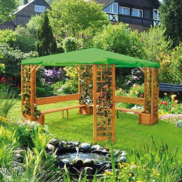 Der Pavillon ist mit zwei Bänken zum Sitzen ausgestattet. Ebenso hat er ein grünes Dach. Dieses passt sich gut an die Honigbraune Farbe des Holzes an. Der gesamte Pavillon ist witterungsbeständig und kann das gesamte Jahr hindurch im Außenbereich stehen gelassen werden.