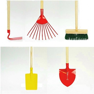 Das Set enthält eine Kinder-Spitzschaufel, einen Kinder-Rechen, einen Kinder-Laubbesen, eine Kinder-Hacke und einen Kinder-Besen. Alle Geräte (außer Besen) sind aus Metall hergestellt und pulverbeschichtet. Der jeweilige Holzstiel ist 76 - 80 cm lang. Es handelt sich um ein deutsches Qualitätsprodukt. Die Kinder bekommen mit den verschiedenen Geräten ein Gespür für die Gartenarbeit und lernen, welches Gerät man für welche Arbeit benötigt.