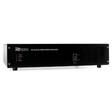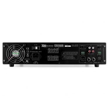 Der Power Dynamics PDV240S ist ein kraftvoller und leistungsstarker Boost-Verstärker. Das Gehäuse des Gerätes ist aus Metall gefertigt. Er bietet Anschlussmöglichkeiten für vier Ohm sowie siebzig Volt und Hundert Volt. An der Geräterückseite befindet sich ein DC-Switch Schalte.