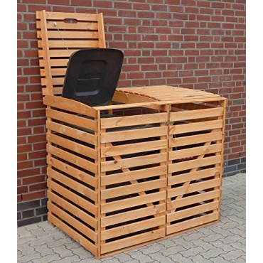 Diese Mülltonnenbox ist die ideale Lösung für alle, die ihre Mülltonnen nicht im Haus unterbringen können oder möchten. Sie bietet Platz für bis zu zwei 120 Liter-Mülltonnen. Hergestellt ist die Box aus Kiefernholz, sie ist wetterbeständig imprägniert. Der Aufbau gestaltet sich schnell und unkompliziert. Eine praktische Kette zum Öffnen der Mülltonnen ist vorhanden. Es kann ein Vorhangschloss zum Abschließen angebracht werden (nicht enthalten).