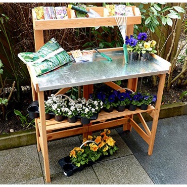 Dieser praktische und stabile Pflanztisch ist aus massiver, imprägnierter Kiefer hergestellt. Die Zinkfläche ist bis über den Rand gearbeitet, dies macht es sehr praktisch, den Tisch nach erledigter Arbeit zu reinigen. Die Ablage ist leicht erreichbar und universell einsetzbar, man kann die Geräte und Materialien sehr geordnet verstauen. Auch große Übertöpfe und Gießkannen lassen sich gut unterbringen, etwa auf der Ablage unterhalb der Arbeitsfläche.