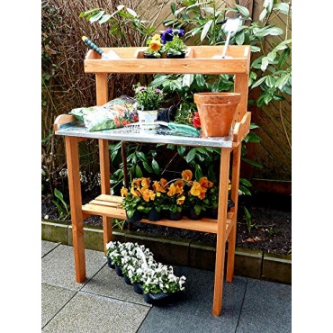 Das Holz ist imprägniert und somit vor Feuchtigkeit, Schmutz und sonstigen äußeren Einflüssen gut geschützt. Das Regal hat eine separate Ablagefläche, welche verzinkt ist. Somit lässt sich diese besonders gut reinigen und säubern. Sie bietet nochmals Platz für diverse Geräte und sonstige, für das Pflanzen und Säen von Pflanzen benötigter Utensilien.