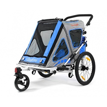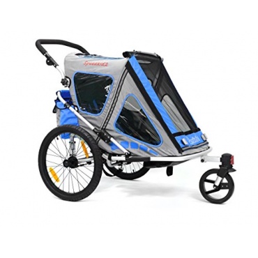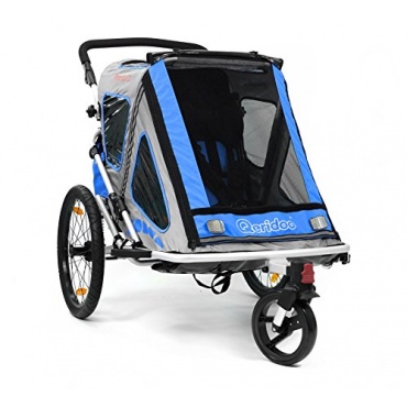 Der blaue Kinder-Fahrradanhänger Speedkid2 von Qeridoo bietet Platz für 1 bis 2 Kinder. Ganz Kleine können zunächst in der Babyschale und später im Kindersitz befördert werden. Die Kinder sitzen in Fahrtrichtung. Zum Lieferumfang gehört ein Buggyrad, damit lässt sich der Anhänger blitzschnell in einen Jogger umwandeln. So muss nicht auf Ausflügen oder im Urlaub extra ein Kinderwagen mitgenommen werden.