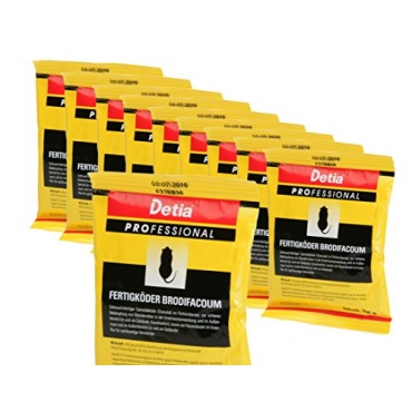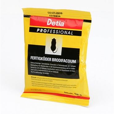 Das Detia Rattengift basiert auf einem für Mäuse und Ratten attraktiv wirkenden Giftköder auf Getreidebasis und wurde mit einem Rattengift versetzt. Als Wirkstoff kommt das Mittel Brodifacoum zum Einsatz. Der Köder wird bereits gebrauchsfertig geliefert und ist sofort einsatzbereit. Durch eine Zugabe von Denatonium Benzoaten ist das Rattengift sowohl für Kinder als auch für Haustiere extrem Bitter und soll ein versehentliches Verschlucken vermeiden. Nagetiere nehmen diesen Geschmack nicht wahr.