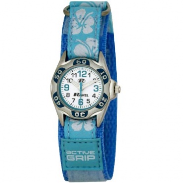 Die analoge Ravel Kinder Armbanduhr ist in einer türkisen Farbe gehalten. Auf dem Armband findet man Abdrücke von Blumen, die Kombination aus Farbe und Motiven macht dieses Produkt sowohl für Jungen als auch für Mädchen interessant. Auch das Ziffernblatt ist sehr modern und leicht für Kinder lesbar.