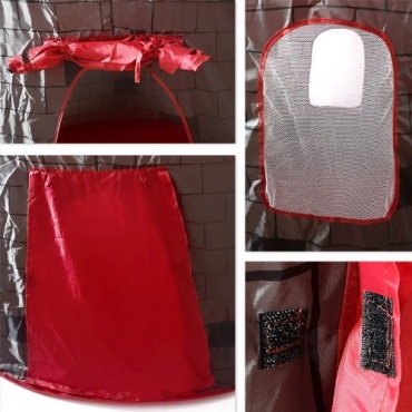 Das Zelt besteht zu 100% aus Polyester. Dadurch können Nutzer es leicht von Verschmutzungen befreien. Es kann auch in einer Waschmaschine gereinigt werden. Das Zelt stellt sich über ein Drahtgestänge auf. Nutzer müssen dazu nur die Stangen in die vorgesehenen Taschen schieben. Das runde Ritterzelt besitzt eine Höhe von 125 cm und einen Durchmesser von 105 cm. Der Türeingang kann über einen Wickelvorhang verschlossen werden. Darüber hinaus verfügt das Zelt über zwei Fenster, die mit einem Gaze versehen sind.