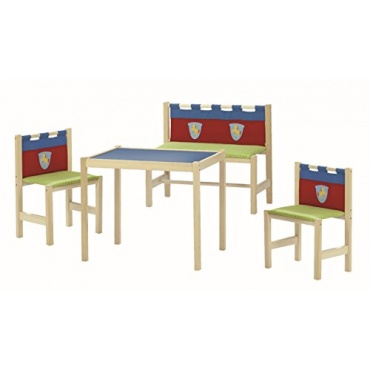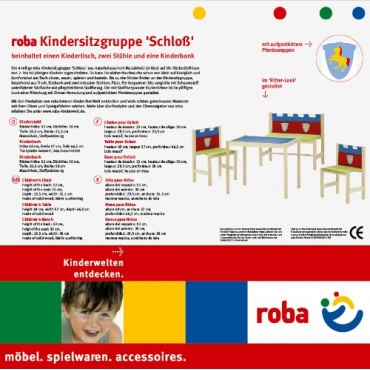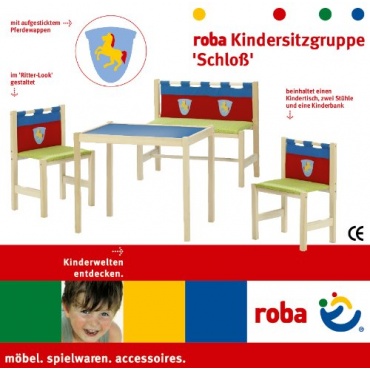 Mit der Kindersitzgruppe Schloss von Roba kann man leuchtende Kinderaugen hervorrufen. Schließlich ist diese Kindersitzgruppe bunt optisch ganz so, wie es Kinder mögen. Diese Sitzgruppe besteht aus einem Tisch und einer Sitzbank sowie zwei Stühlen und lässt sich einfach montieren. Jedoch ist diese Kindersitzgruppe eher für Kinder geeignet, die ruhig sitzen bleiben können und am Tisch malen oder sonstige ruhige Beschäftigungen ausüben.