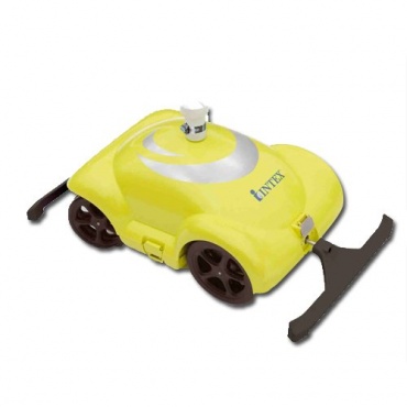 Der gelbe Roboter für die Reinigung des Pools der Marke Intex läuft ganz alleine. Ist er einmal in das Schwimmbad gelassen, startet er mit der Reinigung. So läuft die Poolreinigung des Schwimmbads beinahe voll automatisch ab. Der Schlauch wird an den Wasserauslaß des Pools von innen angeschloßen.