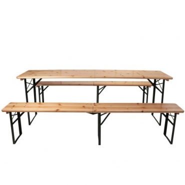 Die Bierzeltgarnitur von Miadomodo besteht aus drei Teilen. Dazu zählen ein Tisch und zwei Sitzbänke. Die Sitzfläche der Bänke und die Tischplatte sind aus stabilem Holz, das auf robusten Metallfüßen ruht und problemlos auch mit einem feuchten Lappen gereinigt werden kann. Die Metallfüße lassen sich leicht anklappen und ermöglichen ein einfaches transportieren und verstauen der Bierzeltgarnitur. Dadurch eignet sie sich auch hervorragend für den Einsatz im eigenen Garten - zumal sie auch problemlos von einer einzelnen Person getragen und aufgebaut werden kann.
