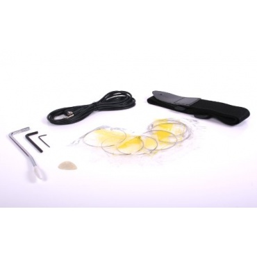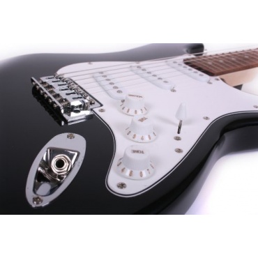 Mit dieser elektrischen Gitarre werden Sie viel Freude haben. Allein der Korpus, in Schwarz und hochglänzend lackiert, erzeugt einen authentischen Rock 'n' Roll Look. Dieses Gitarrenmodell ist nicht gerade ein Einsteiger-Modell, kann aber auch von Musikern mit wenig Spielerfahrung bespielt werden. Die zahlreichen Zusatzbestandteile machen den Einstieg noch einfacher. Es heißt also, Verstärker mit dem mitgelieferten Verstärkerkabel anschließen, Plektrum in die Hand und los geht es mit Rock-Musik.