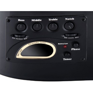 Die Finish Hochglanz Gitarre hat eine Decke aus Fichte. Der Boden und die Zarge siond aus robustem Mahagoni gefertigt. Der Hals der Rocktile und das Griffbrett, sowie die Saitenhalter sind aus Palisander verarbeitet. Ein eingebauter chromatischer Tuner mit Stimmgerät ist vorhanden.