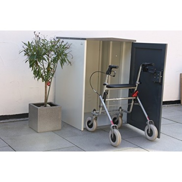 Solide und robust aus pulverbeschichtetem Stahlblech gefertigt ist die Rollatorbox. Aufgrund der Verarbeitung der Rollatorbox ist diese witterungsbeständig und lässt sich auch im freien gut aufstellen. Die Rollatorbox lässt sich einfach verschließen, sodass der Rollator stets geschützt untergebracht werden kann. Damit die Rollatorbox einfach zu nutzen ist, ist sie mit einer Rampe ausgestattet. So kann man den Rollator einfach und ohne großen Aufwand ein- und ausfahren. Die Abmessungen der Rollatorbox betragen 75 x 75 x 115 cm , bei einem Gewicht von 70 kg. Farblich ist die Rollatorbox in einem Grau gehalten.