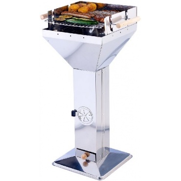 Der große Säulengrill in Trichterform hat eine Höhe von 92 Zentimeter. Der Standfuß ist besonders stabil und bietet ein Grillvergnügen ohne zu wackeln. Der verchromte Grillrost mit Griffen aus Holz ist drei-fach verstellbar. Die Grillfläche hat eine Grösse von 36 x 36 Zentimeter. Der Kaminzugeffekt bringt die perfekte Hitze auf dem Grillrost. Ein Rädchen mit sechs Lüftungsschlitzen sorgt für ausreichende Luftzufuhr an der Säule.