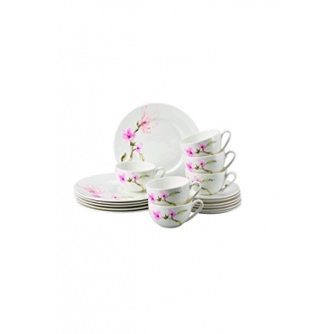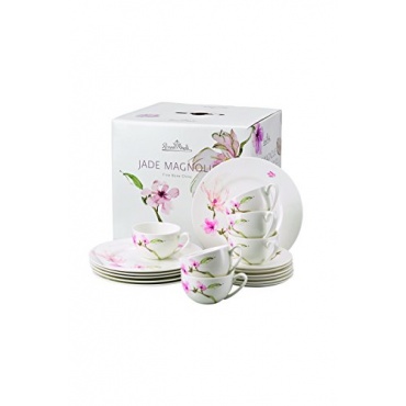 Das achtzehn teilige Rosenthal Jade Magnolie Kaffeeservice besteht aus sechs Frühstücksteller mit einem Druchmesser von 23 Zentimeter und sechs Kombi-Tassen. Mit diesem Kaffeegeschirr wird die Tafel Frühlingshaft eingedeckt. Hellrosa leuchtende Magnolien schmücken das Service.