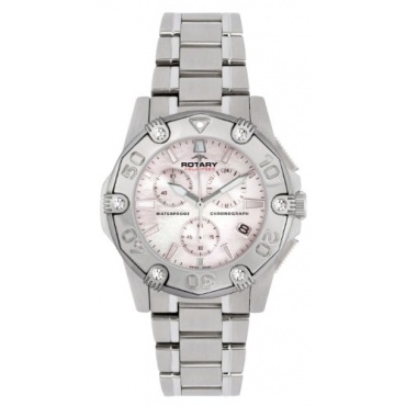 Aus hochwertigem Edelstahl besteht das Gehäuse der Damen-Armbanduhr Aquaspeed Chronograph von Rotary und ist mit einem Zifferblatt in Rosa ausgestattet. Sie ist bis 10 Meter wasserdicht und hat eine Stoppuhr sowie eine Datumsanzeige. Das Gliederarmband aus Edelstahl ist mit einer Klappschließe versehen.