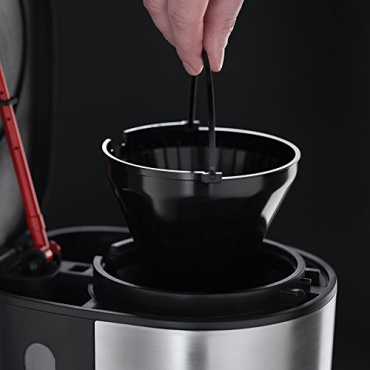 Diese Kaffeemaschine ist im unverkennbaren Russell Hobbs Design gestaltet. Mit ihren Maßen von 21 x 27 x 35,5 cm ist sie sehr kompakt und kann platzsparend aufgestellt werden. Der Filterhalter ist herausnehmbar und kann somit leichter gereinigt werden. Die Kaffeemaschine verfügt über eine Warmhalteplatte und eine Tropf-Stoff-Funktion, wenn die Kanne entnommen wird. Wird sie nicht mehr gebraucht, schaltet sie sich automatisch ab. Zu weiteren Ausstattungsmerkmalen zählen die Wasserstandsanzeige mit Füllmengenmarkierung, ein integrierter Messlöffel und die Kontrollleuchte.