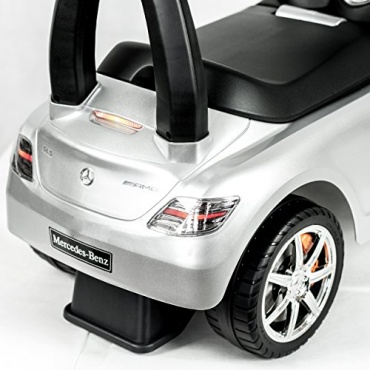 Im aufklappbaren Fach unter dem Fahrzeugsitz haben die Kinder ein gutes Versteck für ihr Lieblingsspielzeug. Eine Rückenlehne sowie die an Heck des Fahrzeugs befindliche Umkippstütze gehören ebenfalls zur Ausstattung des Bobby Cars. Die süße mit in das Fahrzeug integrierte Hupe verfügt über verschiedene Funktionen mit Sound. Auf dem Lenkrad, welches die vordere Achse des Rutschautos lenkt, befindet sich ein großer Stern von Mercedes-Benz. Das Auto ist für den Gebrauch zu Hause und draußen geeignet.
