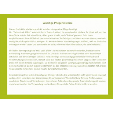 Der Stuhl kann auch bei schlechtem Wetter draußen verbleiben und muss nicht immer gleich weggeräumt werden. Es handelt sich um einen Klappstuhl, dies ermöglicht eine platzsparende Lagerung im Winter. Man entscheidet sich für einen Stuhl mit angenehmem Sitzkomfort und tollem Design. Die Höhe des Stuhls beträgt ca. 88 cm, die Breite ca. 55 cm und die Tiefe ca. 38 cm. Eine Behandlung mit speziellem Öl zur Pflege ist von Zeit zu Zeit empfehlenswert.
